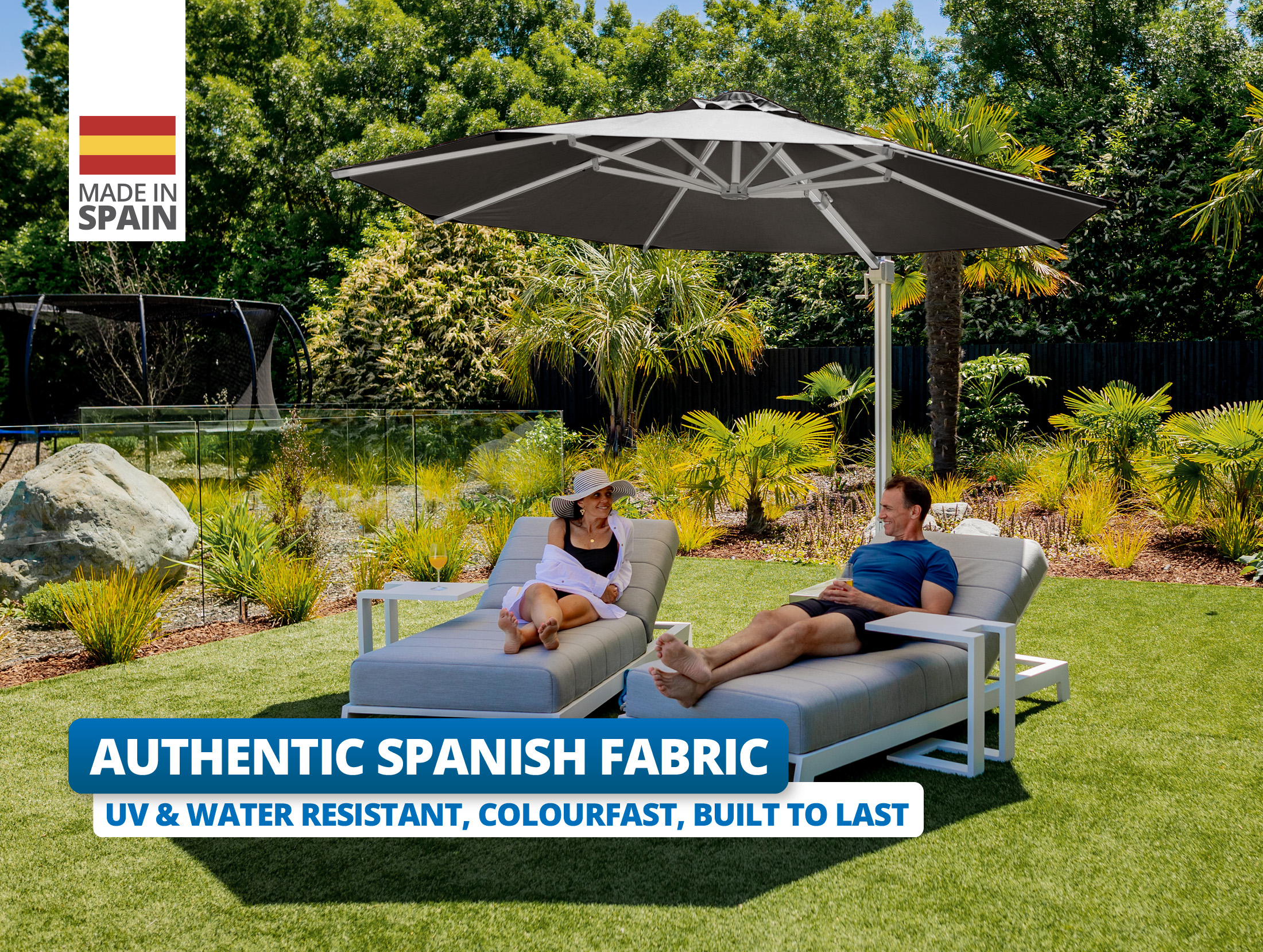 The Granada is a premium cantilever umbrella at an affordable price. Its large canopy is made from authentic Spanish fabric. Its easy-to-use 360° rotating tilt system will provide endless options for safe family fun in the sun.