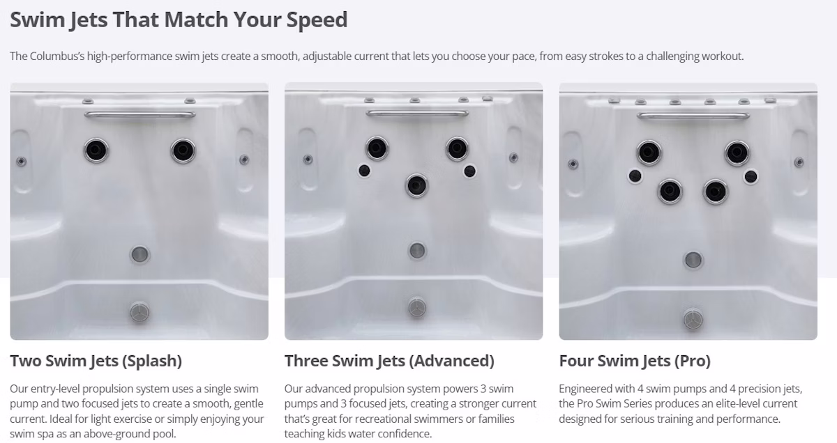 Two jets are great for light exercise, three jets suit most swimmers, and four jets create the strongest current for advanced training.